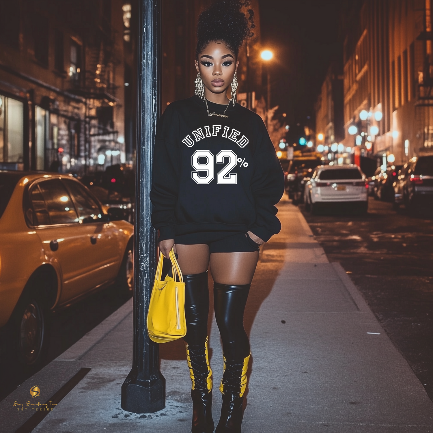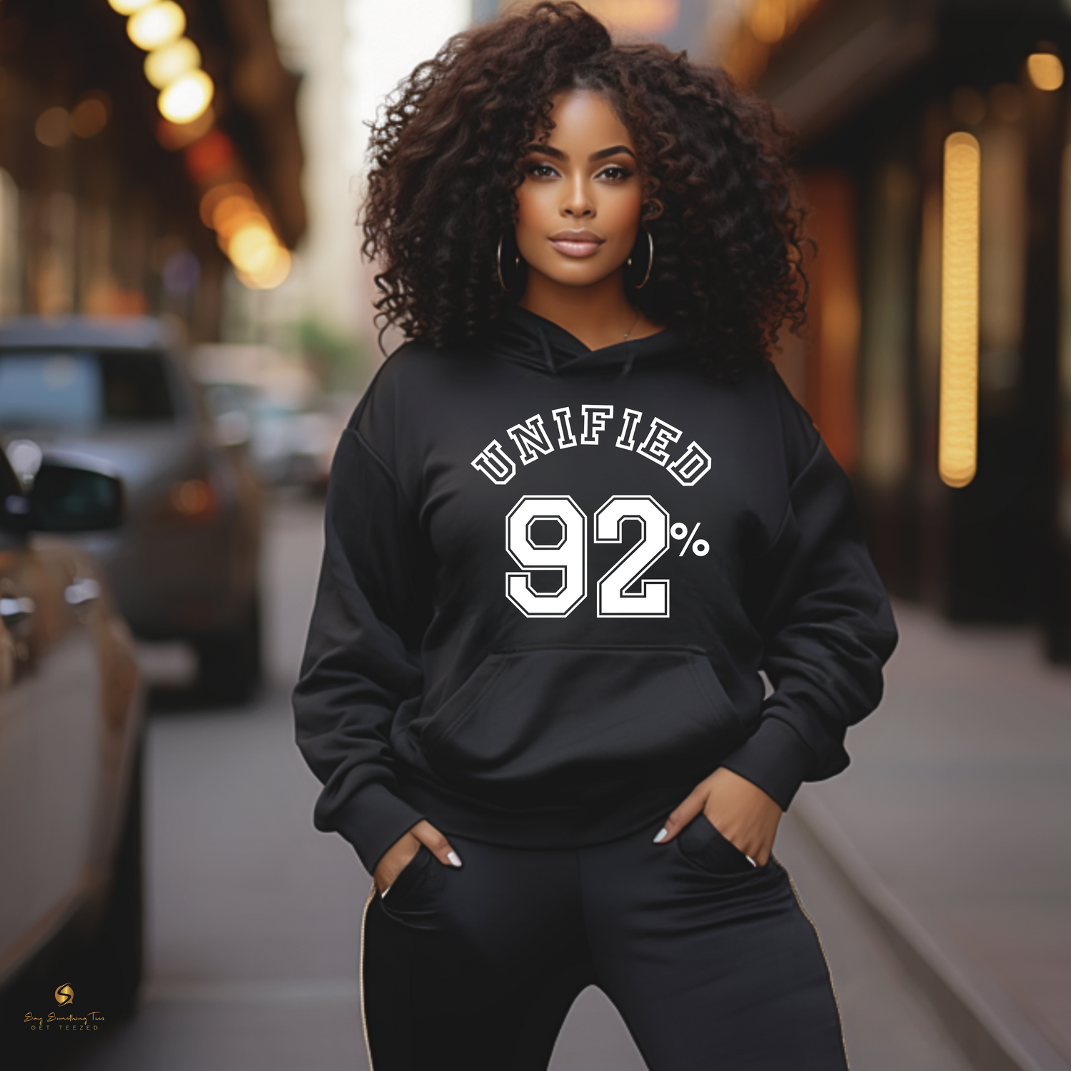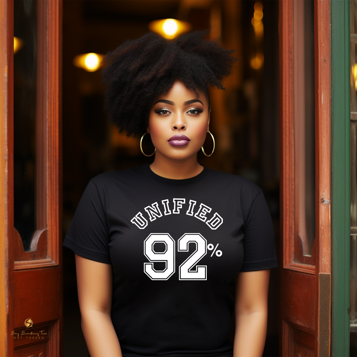 Show your pride and unity with our '92% Unified' jersey-style design, featuring a bold 92% centered with 'UNIFIED' displayed across the top. This sleek and powerful design symbolizes the collective strength of Black women, standing together in resilience and solidarity. Offered in black with striking white lettering, this statement piece is available as a t-shirt, crewneck sweatshirt, or hoodie. Represent the power of the 92% today!